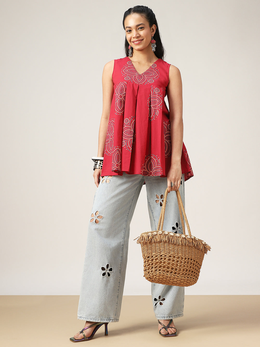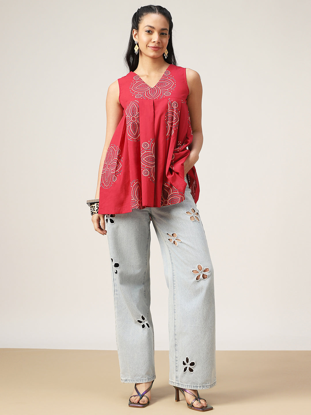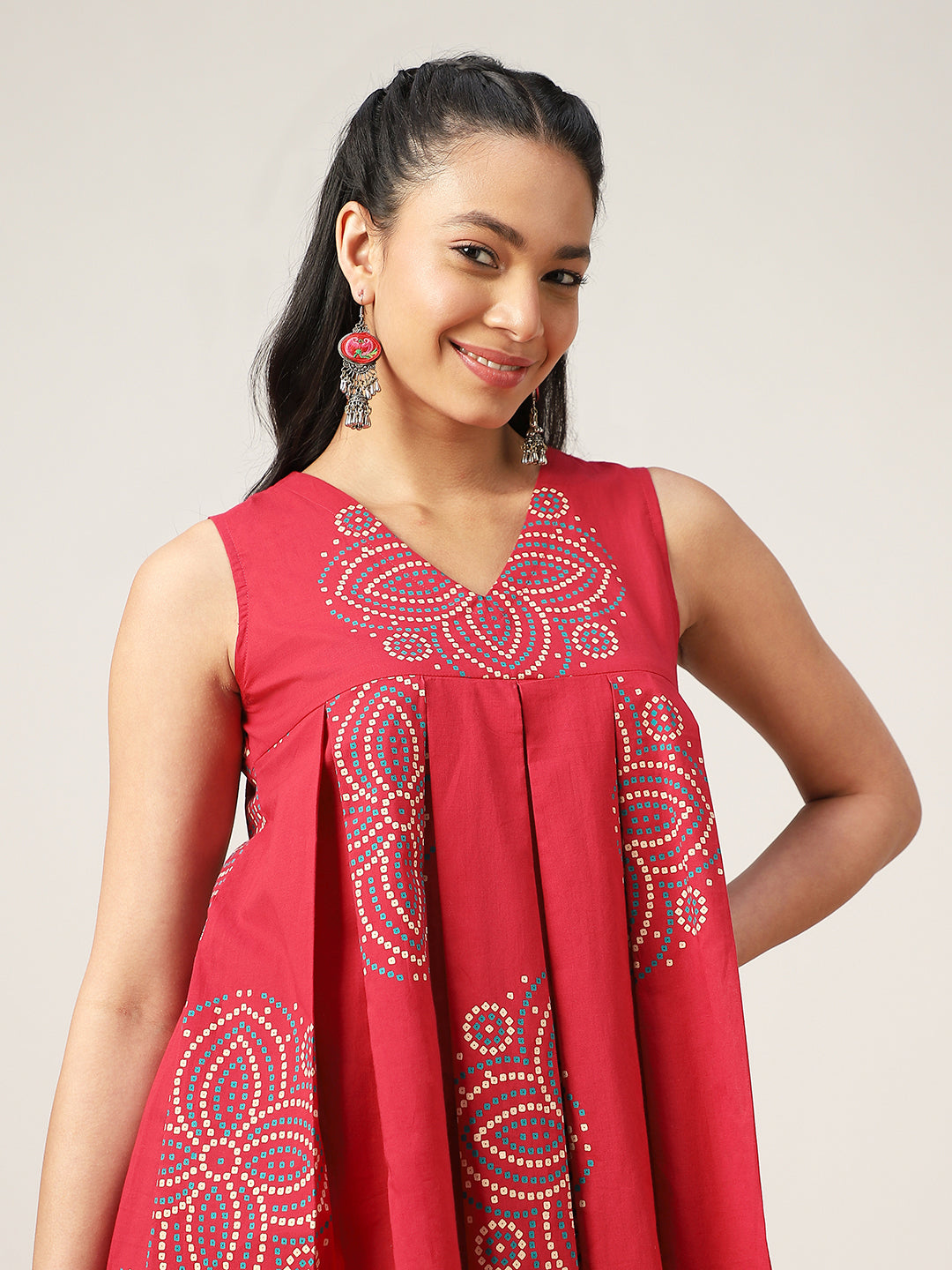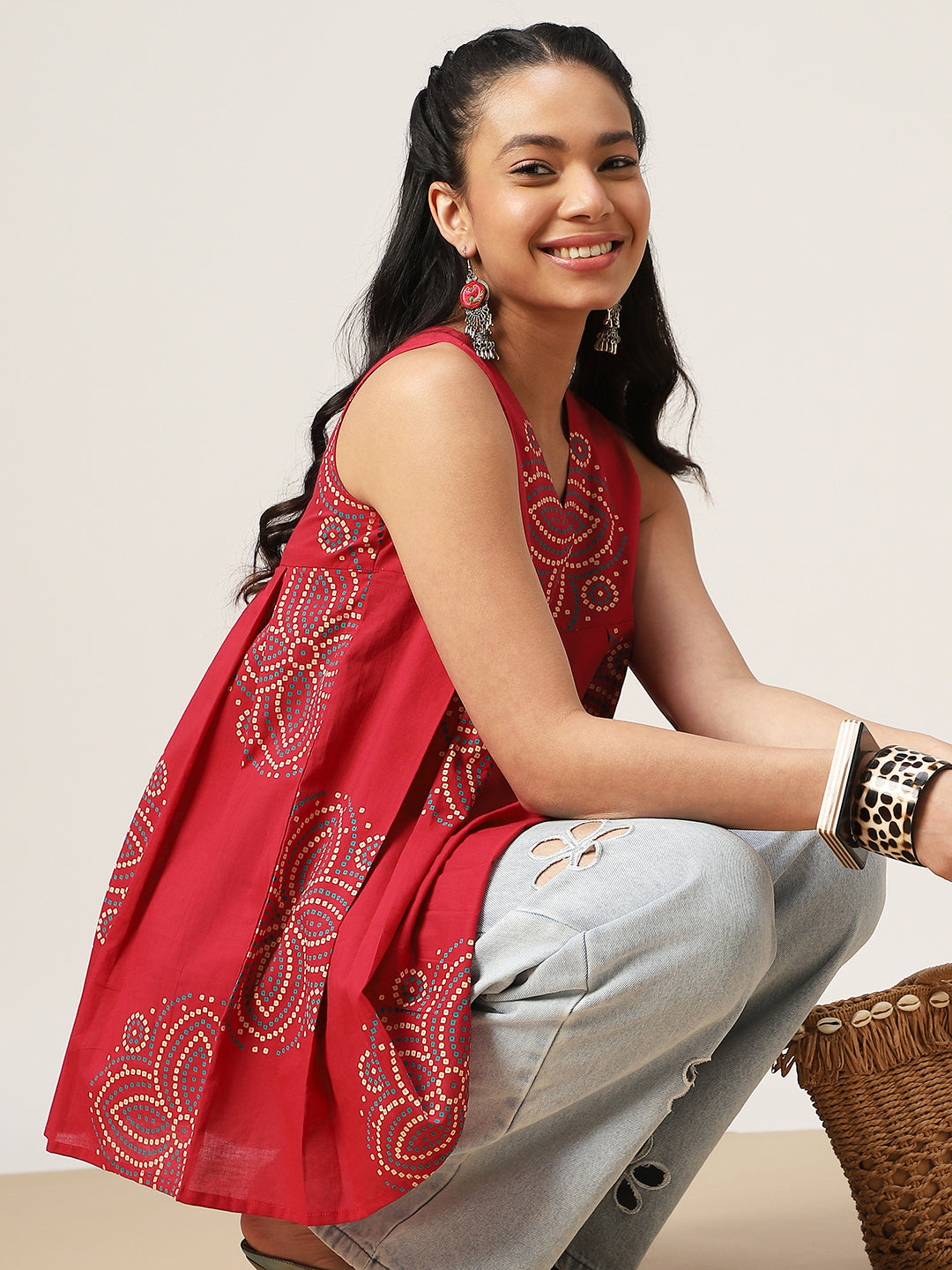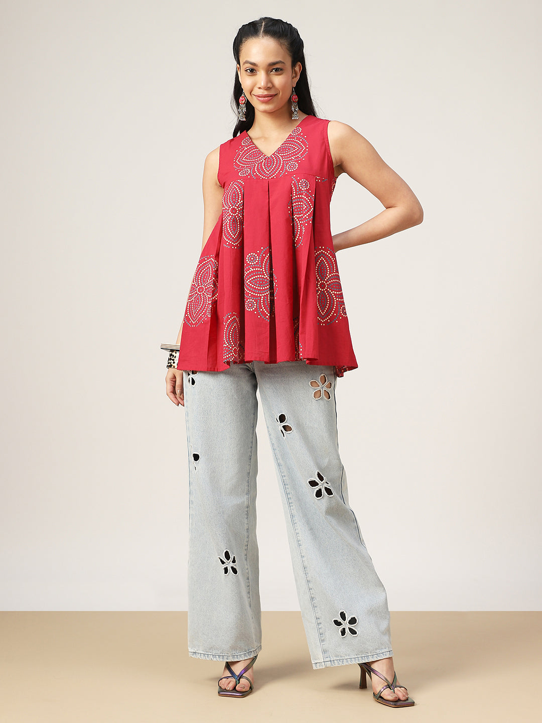 Gulmohar Jaipur Cotton Printed Flared Top. Crafted from soft and breathable cotton fabric, this coral-toned top features a stylish flared silhouette that ensures comfort and effortless elegance. The sleeveless design and flattering V-neckline make it perfect for warm days, while the vibrant print adds a touch of ethnic charm. Designed at a hip-length, this versatile top pairs beautifully with jeans, trousers, or skirts for a relaxed yet stylish look.