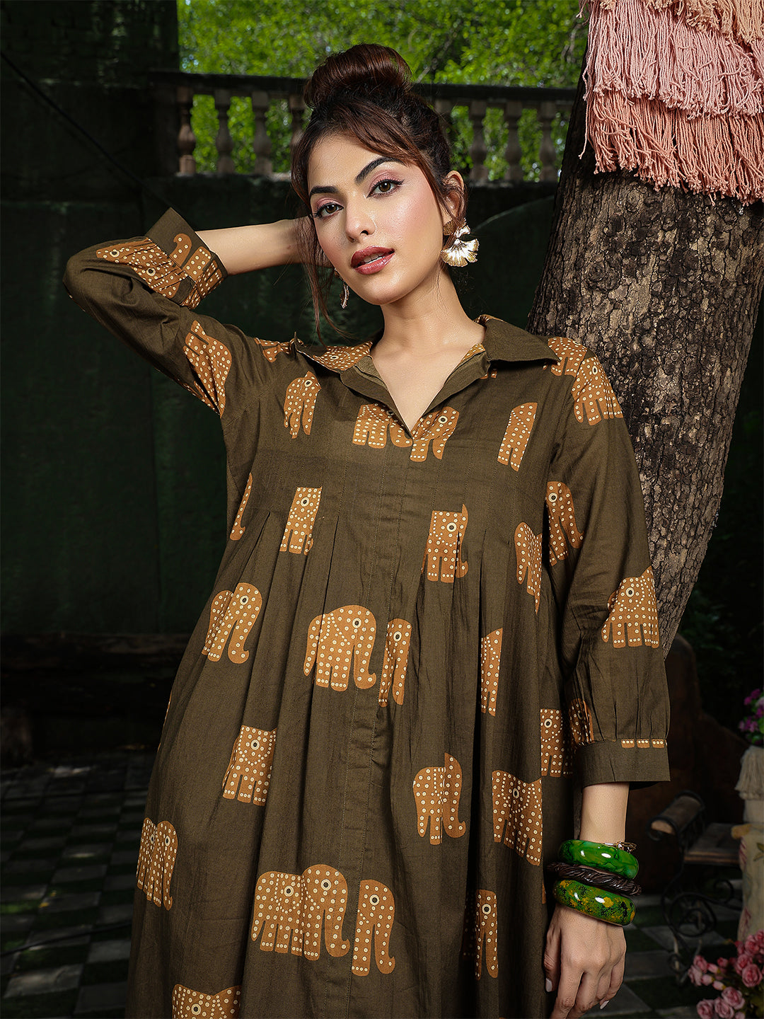 Gulmohar Jaipur Cotton Calf Length Printed Full Sleeve Shirt Collar Flared Dress