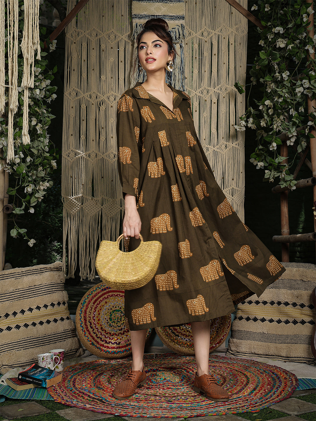 Crafted from soft breathable cotton, the dress comes with an all-over printed pattern that enhances its charm. The shirt collar neckline adds a smart, structured appeal, while the full sleeves give it a balanced and elegant finish. Perfect for casual outings, workwear, or small gatherings, this dress is a versatile addition to your collection.