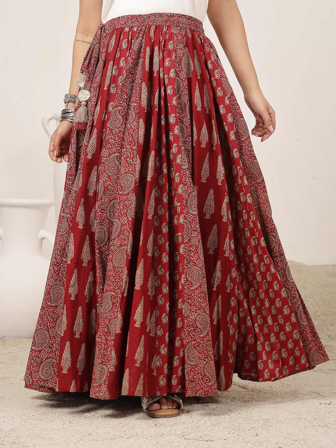 Gulmohar Jaipur Cotton Printed Flared Skirt in a rich maroon shade. Crafted from soft and breathable cotton fabric, this ankle-length skirt offers all-day comfort along with a graceful, flowy silhouette. The flared design adds effortless movement, while the classic printed pattern lends timeless ethnic appeal. Ideal for daily wear, casual outings, or festive occasions, this versatile skirt pairs beautifully with kurtas, crop tops, or ethnic blouses.