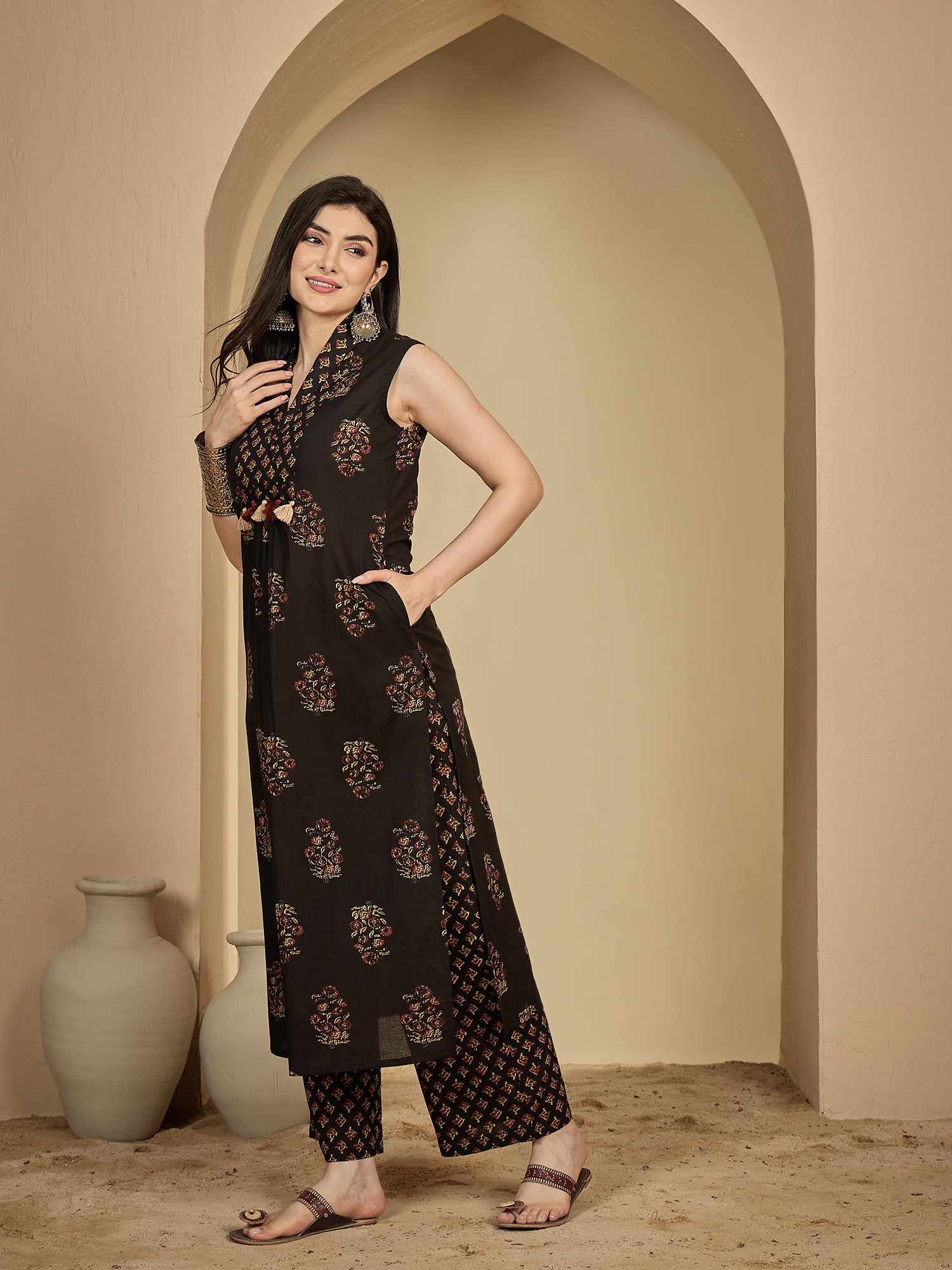Gulmohar Jaipur Cotton Calf Length Printed Sleeveless Collard Straight Kurta Suit Set
