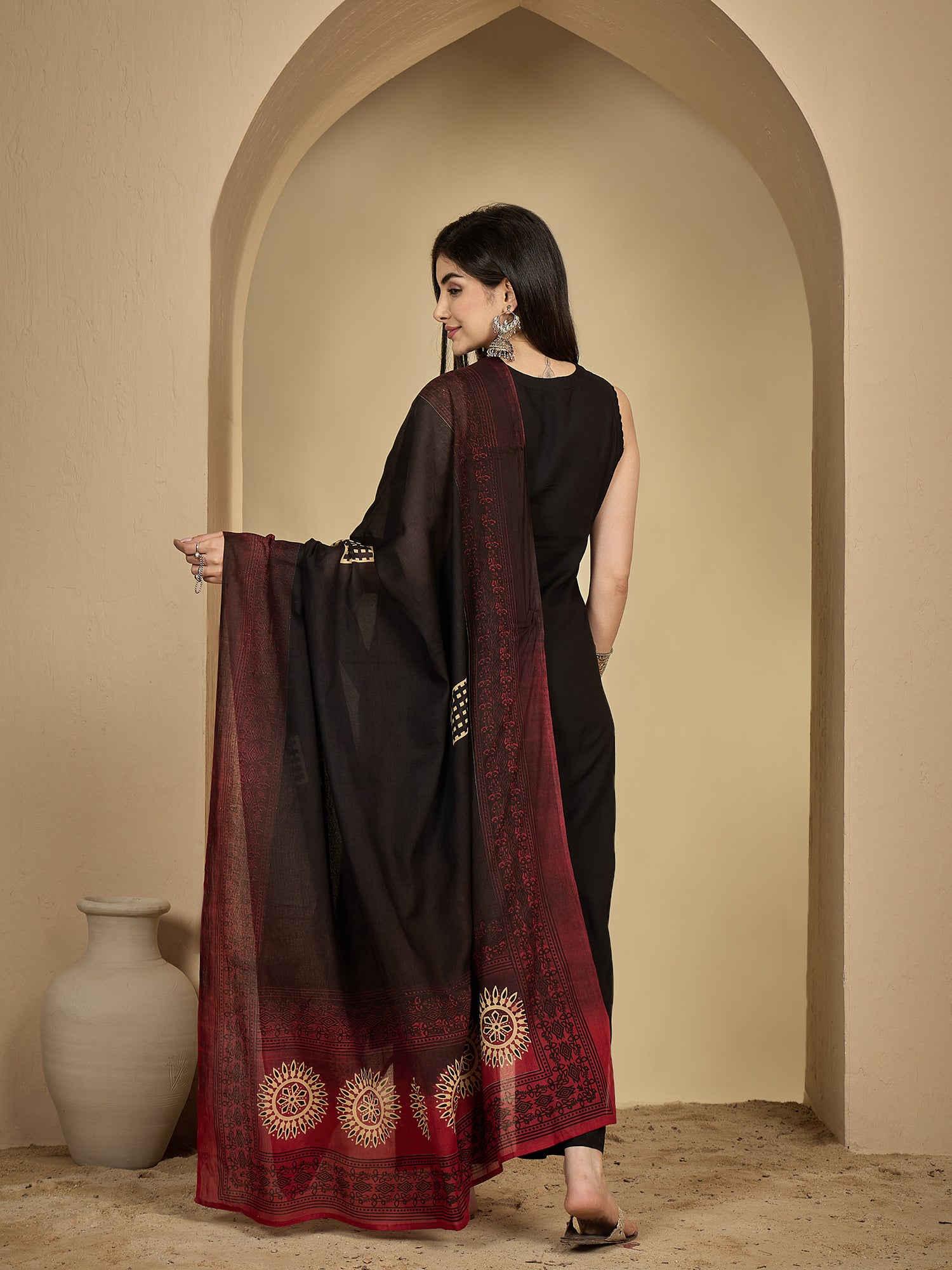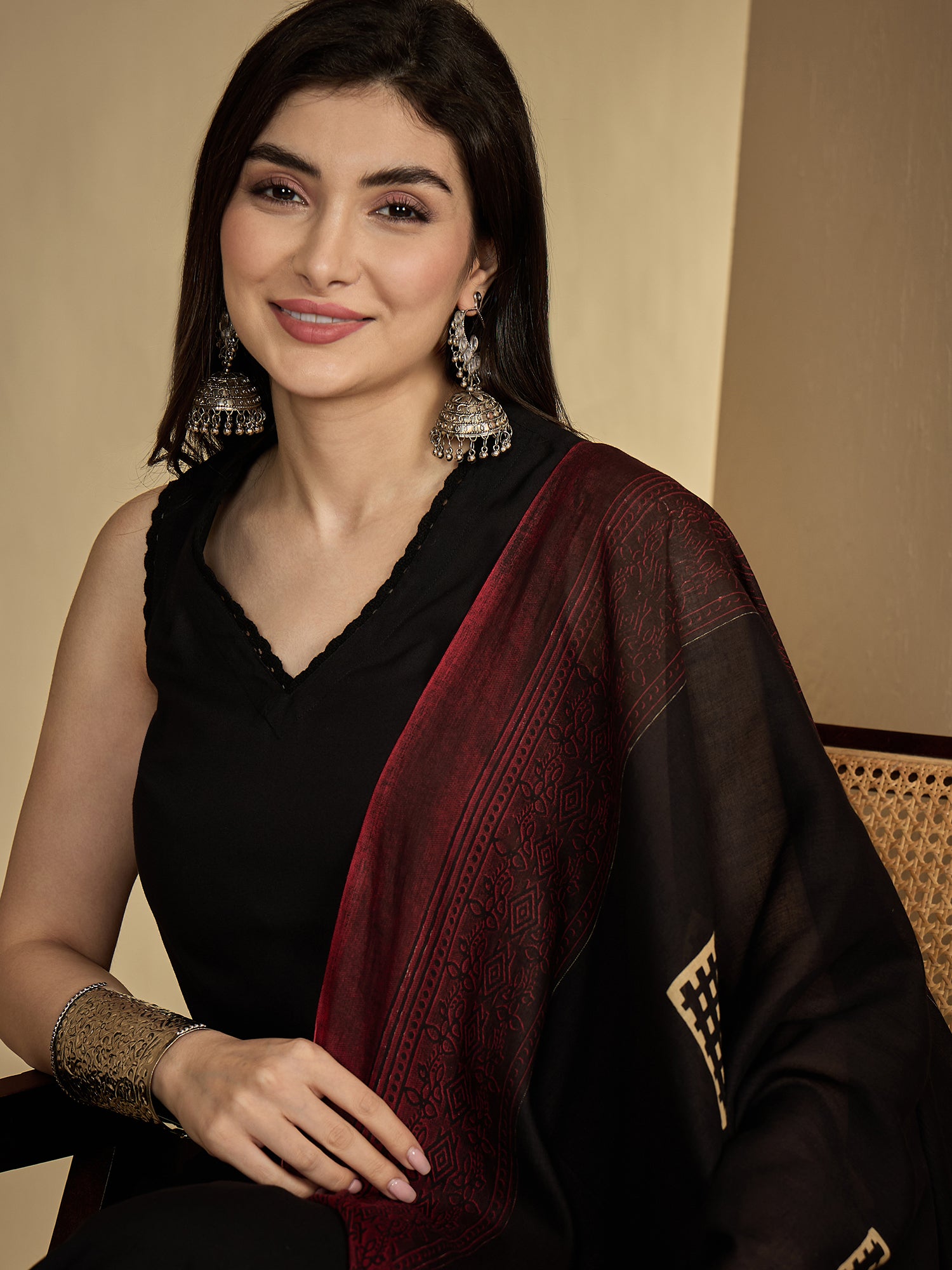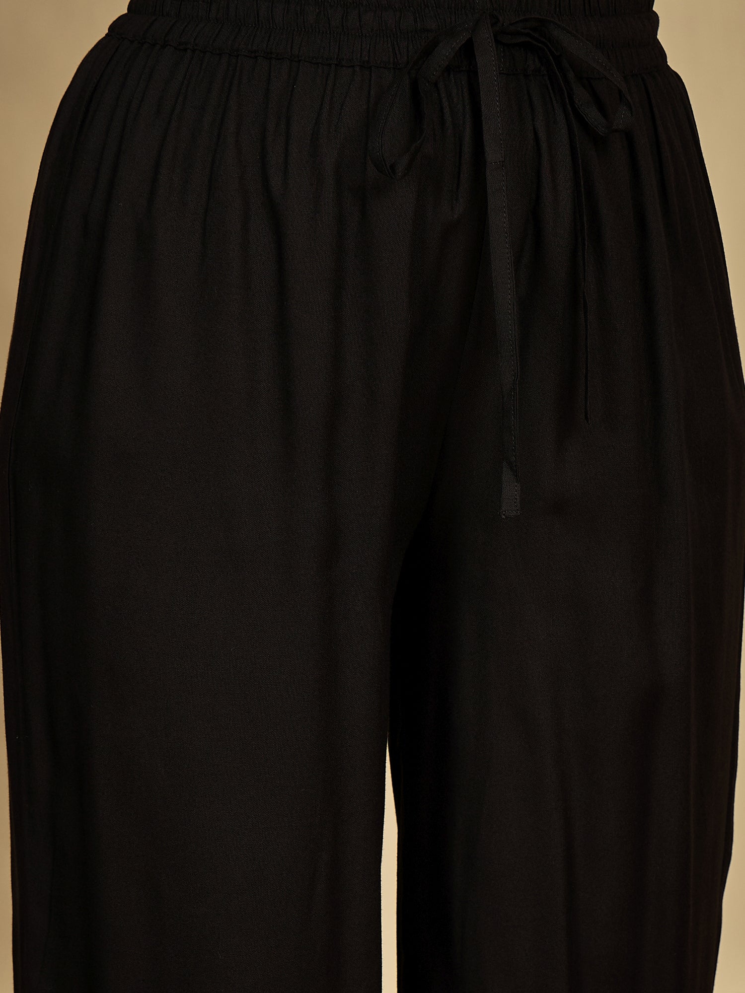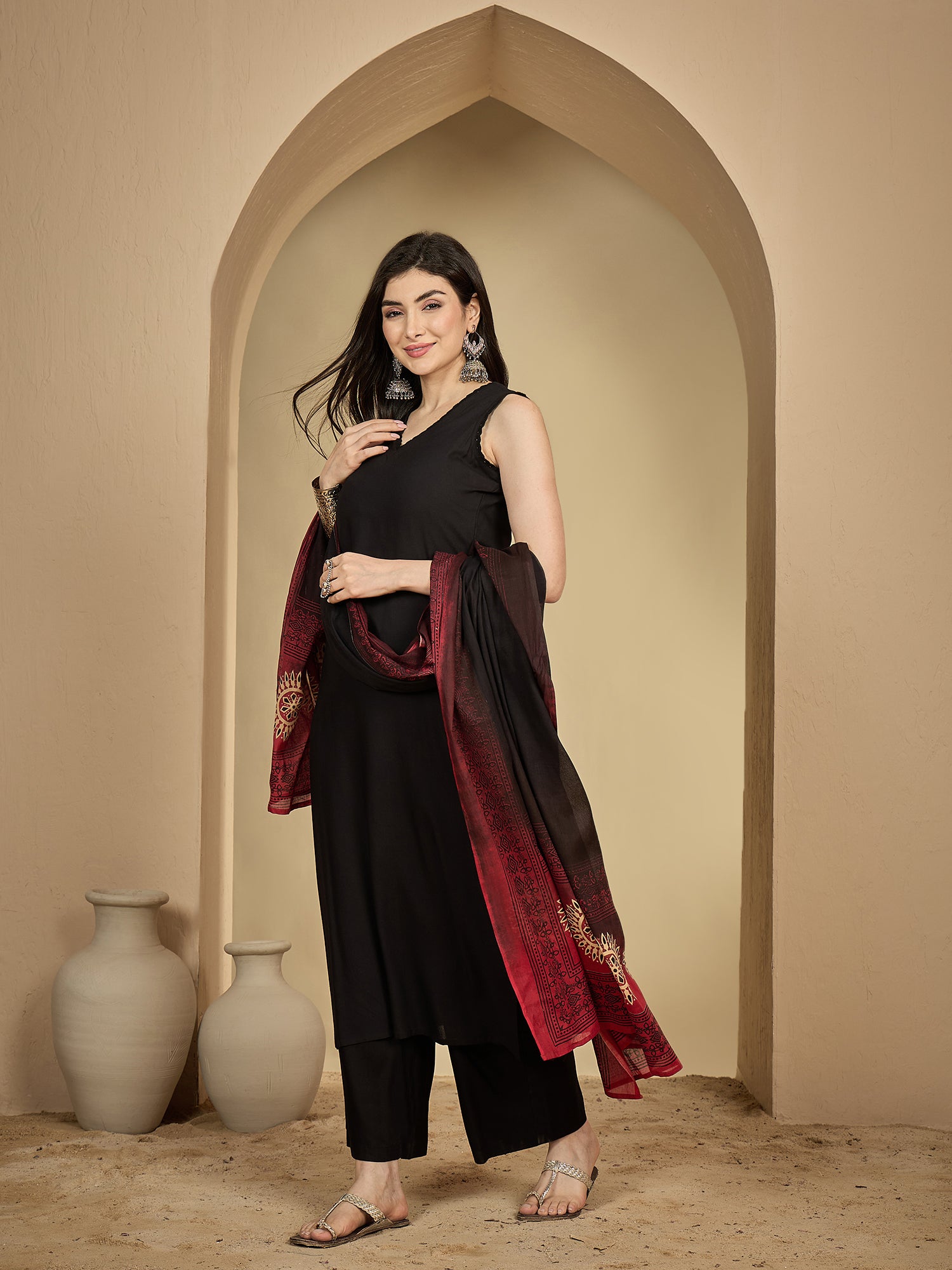 Elevate your everyday elegance with the Gulmohar Jaipur Rayon Calf Length Solid Sleeveless V-Neck Straight Kurta Suit Set. Crafted from premium-quality rayon, this outfit ensures a smooth, breathable, and flowy feel for all-day comfort. The solid black color exudes timeless sophistication, while the sleeveless V-neck design adds a modern edge. The straight silhouette flatters every body type, making it a perfect choice for both casual and semi-formal occasions.