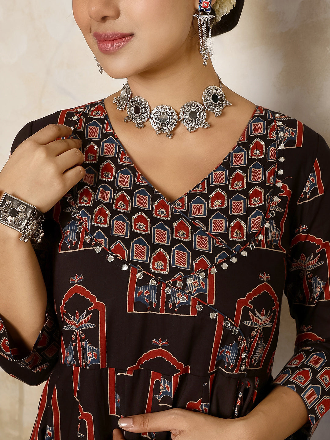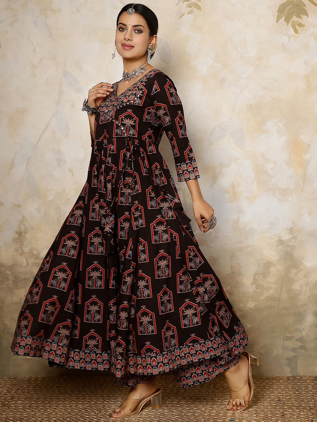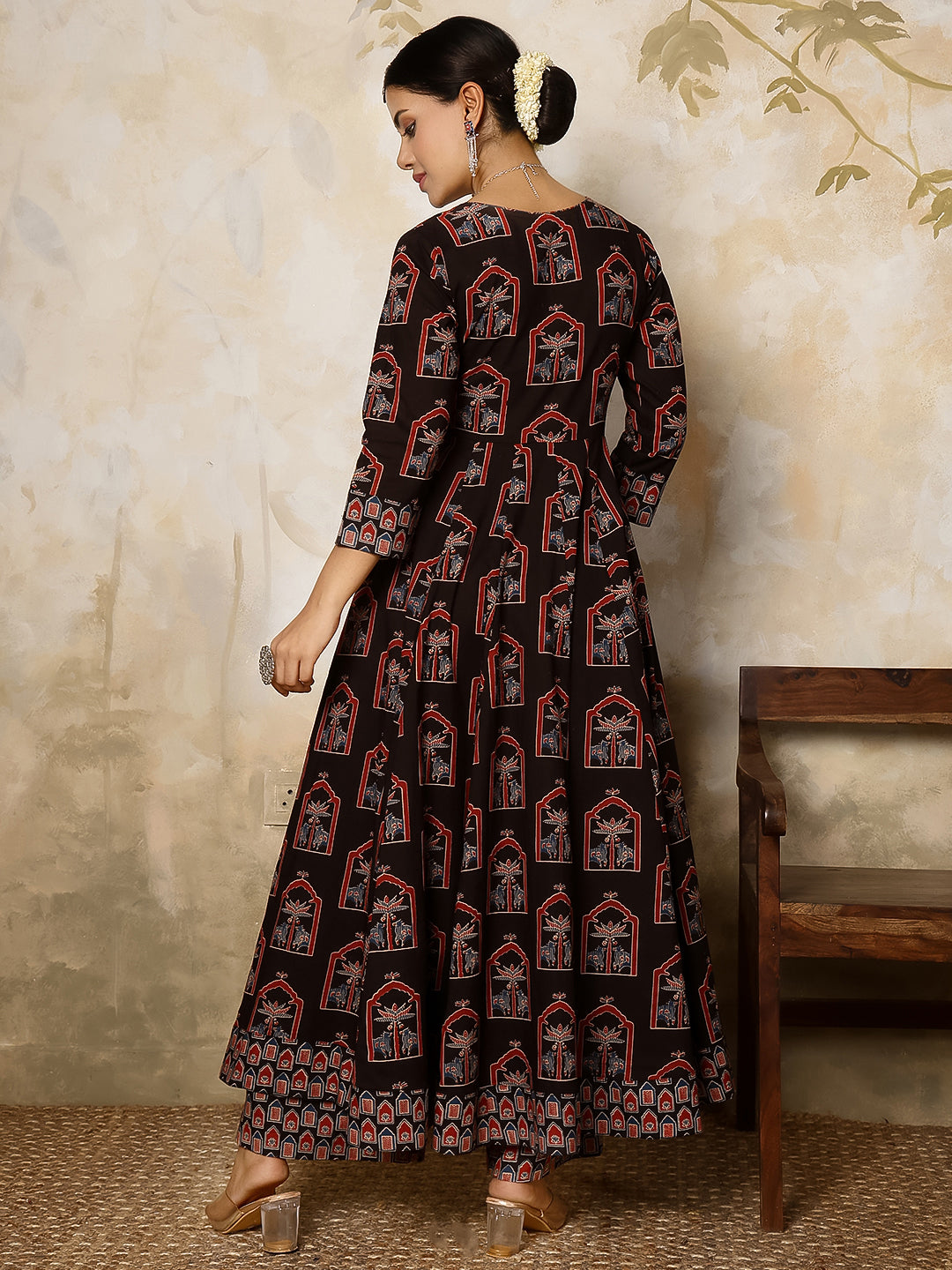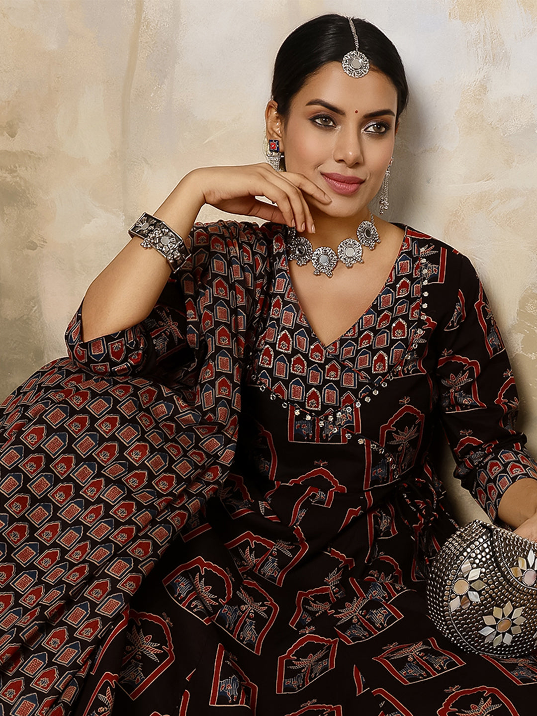 Maroon Cotton Calf Length Printed V-Neck Anarkali Kurta Suit Set