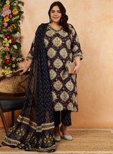 Indigo Cotton Calf Length Printed Flared V-Neck Kurta Suit Set