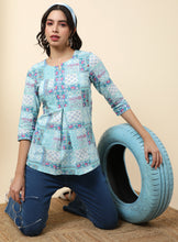 Blue Cotton Flex Calf Length Printed Mandarin Coller A-Line Kurta