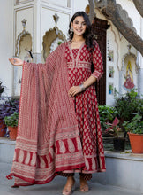 Maroon Cotton Calf Length Printed V-Neck Anarkali Kurta Suit Set