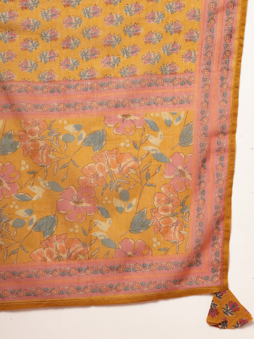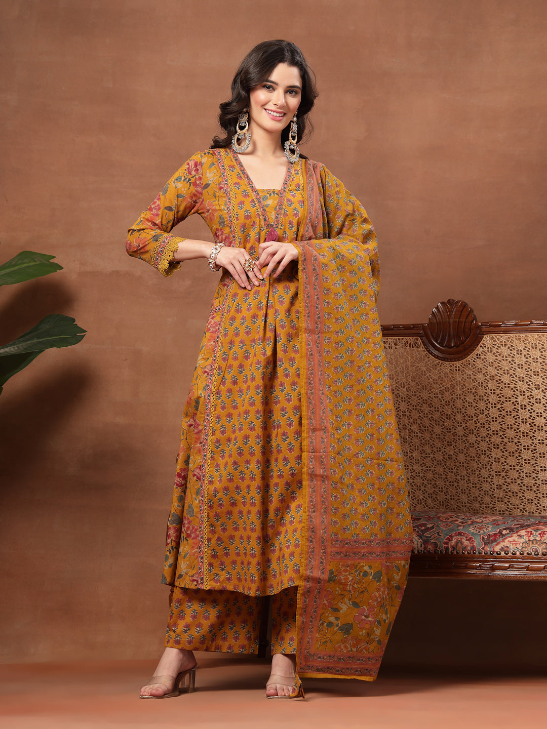 Gulmohar Jaipur Cotton Printed Kurta Suit Set in a rich mustard shade. Crafted from breathable cotton fabric, this calf-length kurta features a flattering flared silhouette that ensures all-day comfort and graceful movement. The V-neckline and three-quarter sleeves enhance its classic appeal, while the elegant printed pattern brings a timeless ethnic charm. Paired with a matching palazzo and a soft malmal dupatta, this set is ideal for everyday wear.