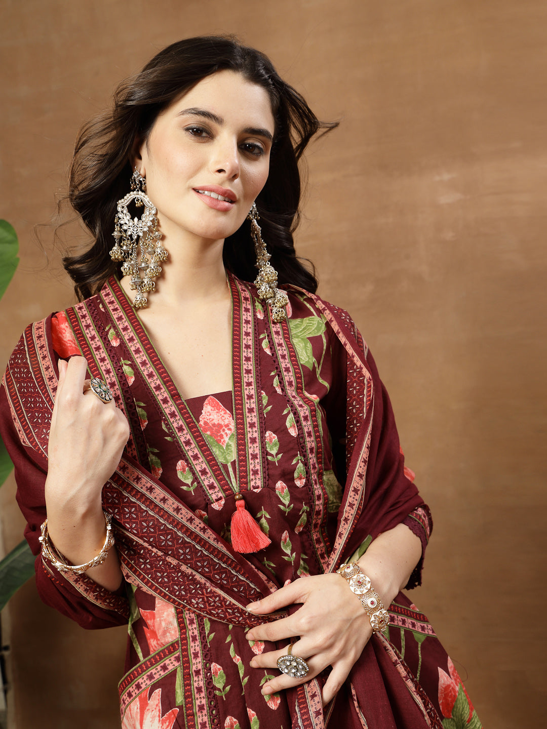 Gulmohar Jaipur Cotton Printed Kurta Suit Set in a rich wine shade. Crafted from soft and breathable cotton fabric, this calf-length kurta features a graceful flared silhouette that ensures comfort and style throughout the day. The classic V-neckline paired with three-quarter sleeves enhances its traditional appeal, while the beautiful printed pattern reflects authentic Jaipur artistry. Completed with a matching palazzo and a lightweight malmal dupatta, this suit set is ideal for daily wear and relaxed casual occasions.