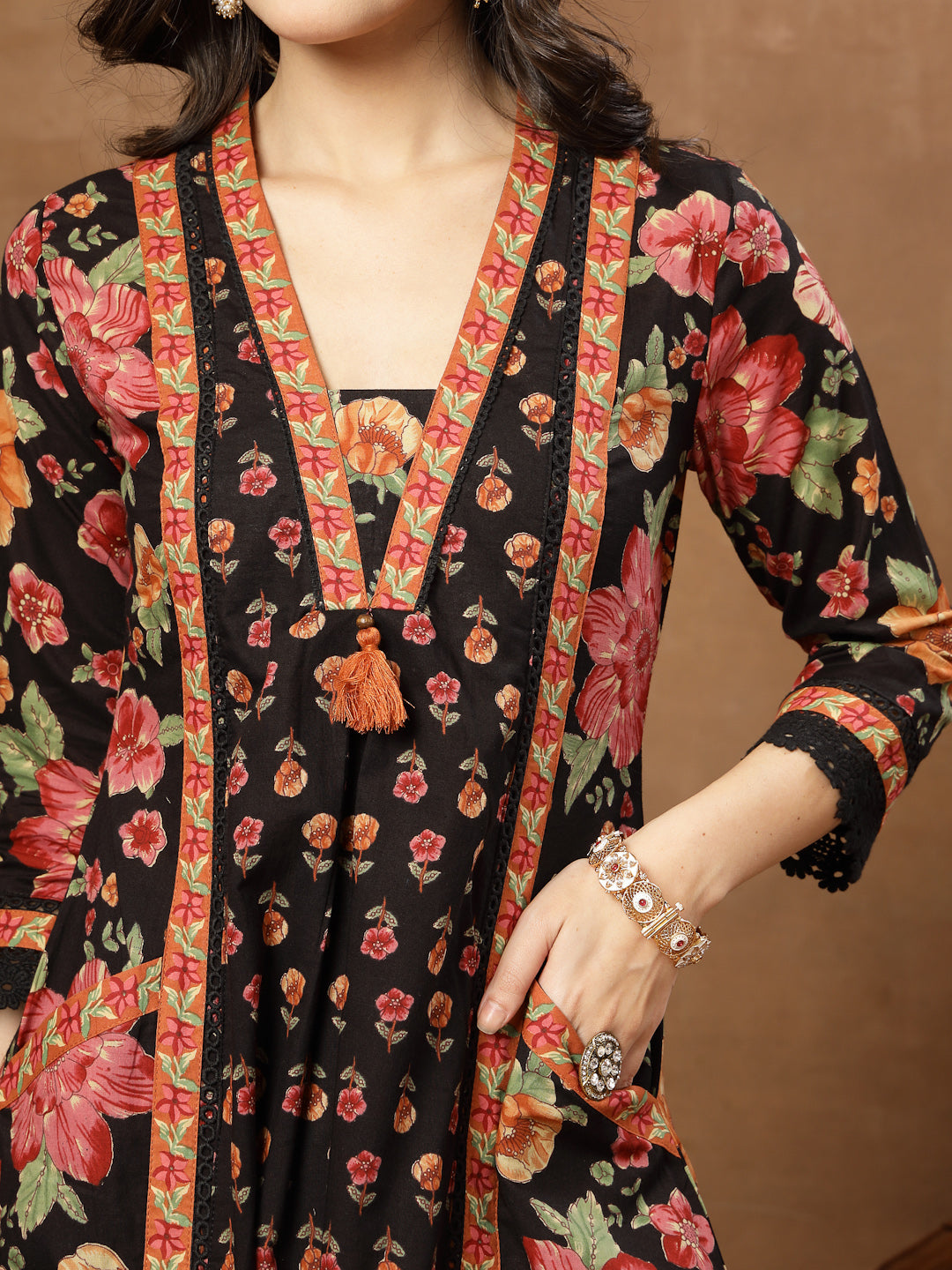 Gulmohar Jaipur Cotton Printed Kurta Suit Set in a timeless black shade. Made from soft, breathable cotton, this calf-length kurta features a flattering flared silhouette that offers ease of movement and all-day comfort. The elegant V-neckline and three-quarter sleeves add a classic touch, while the printed design showcases refined Jaipur-inspired aesthetics. Paired with a coordinated palazzo and a lightweight malmal dupatta, this suit set is perfect for daily wear and casual outings.