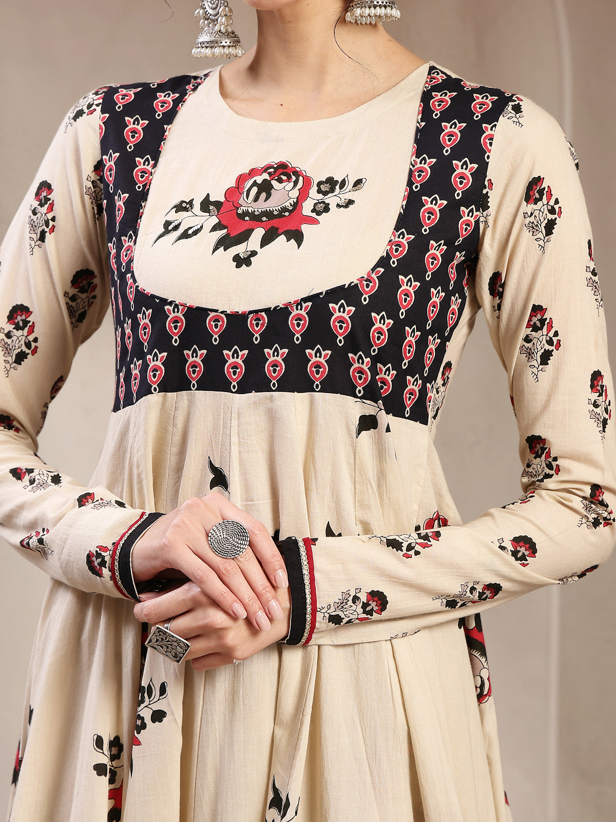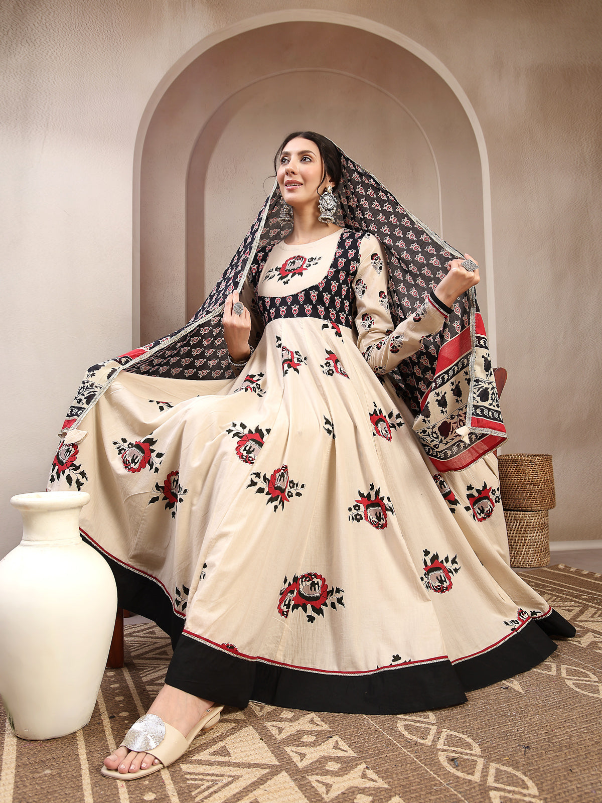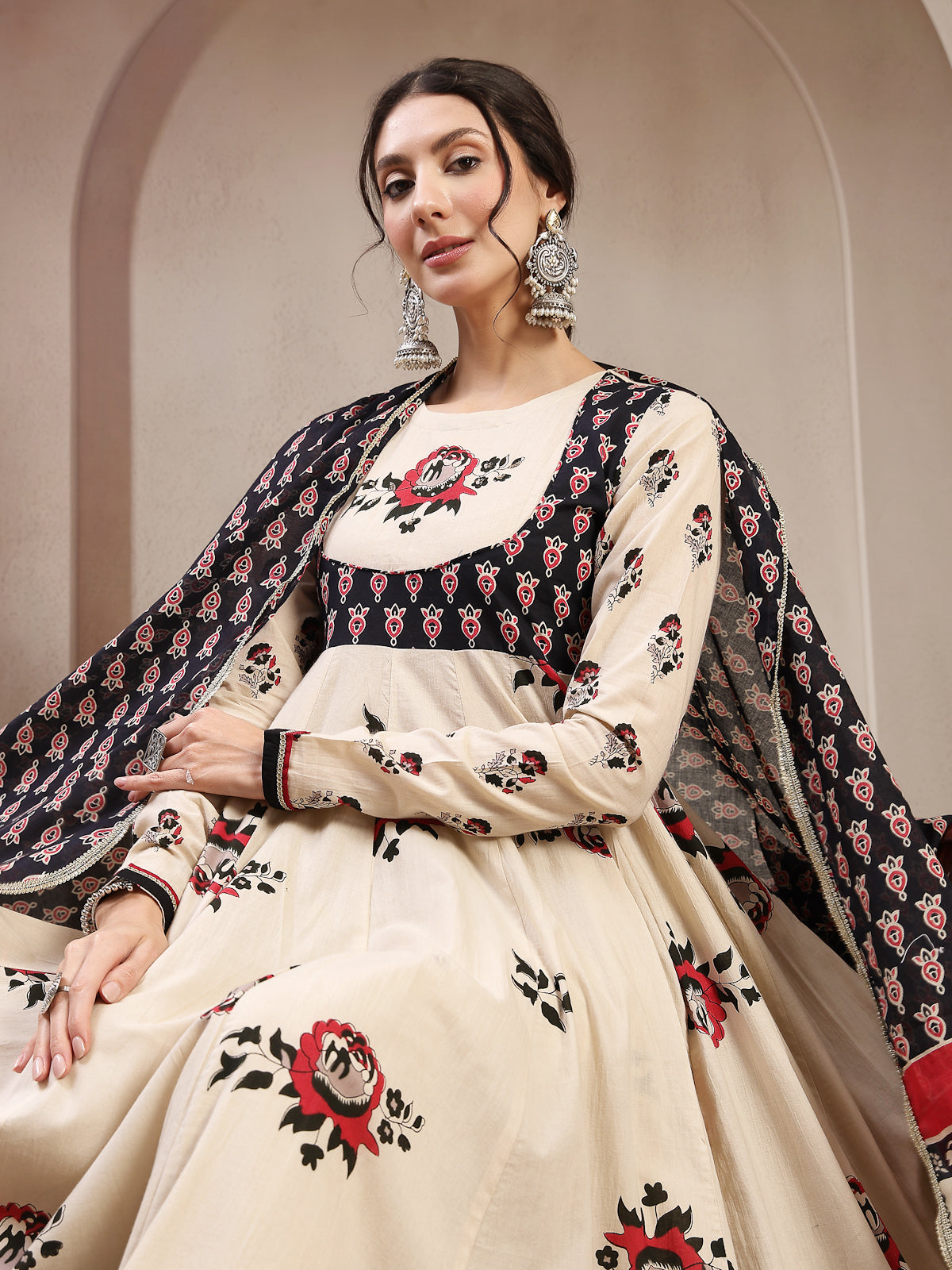 Gulmohar Jaipur Cotton Printed Flared Kurta Set in a soothing ivory shade. Crafted from soft and breathable cotton fabric, this calf-length kurta ensures all-day comfort while offering a refined ethnic appeal. Designed with a classic round neckline and full sleeves, it features a flared silhouette that adds elegant movement and a flattering fit. The beautiful printed pattern enhanced with delicate sequin embellishment lends a subtle festive charm. Paired with a matching palazzo, this kurta set is perfect for daily wear, casual outings, festive gatherings, or office wear. Style it with minimal jewelry and ethnic footwear for a polished look.