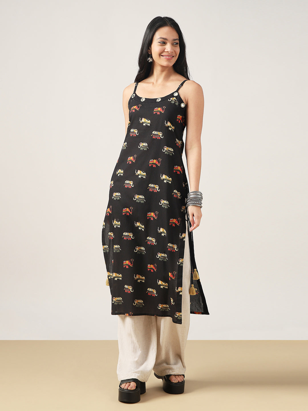 Gulmohar Jaipur Rayon Printed Straight Kurta in a classic black shade. Crafted from soft and lightweight rayon fabric, this calf-length kurta offers a smooth drape and all-day comfort. The sleeveless silhouette paired with stylish strappy neckline gives it a modern appeal, while the printed design enhanced with delicate mirror work adds subtle elegance. Perfect for casual outings, day events, or festive get-togethers when styled with palazzos or leggings.