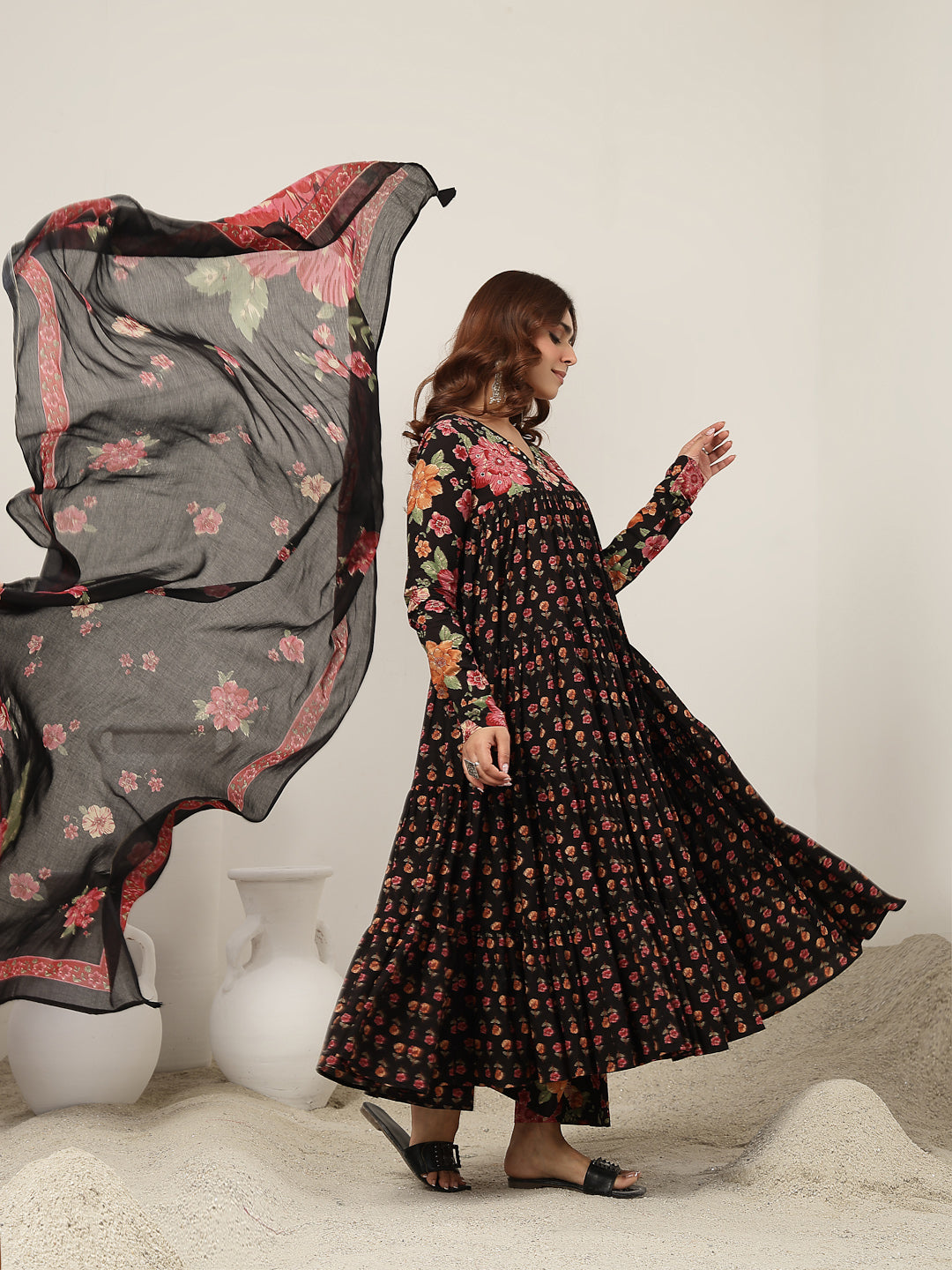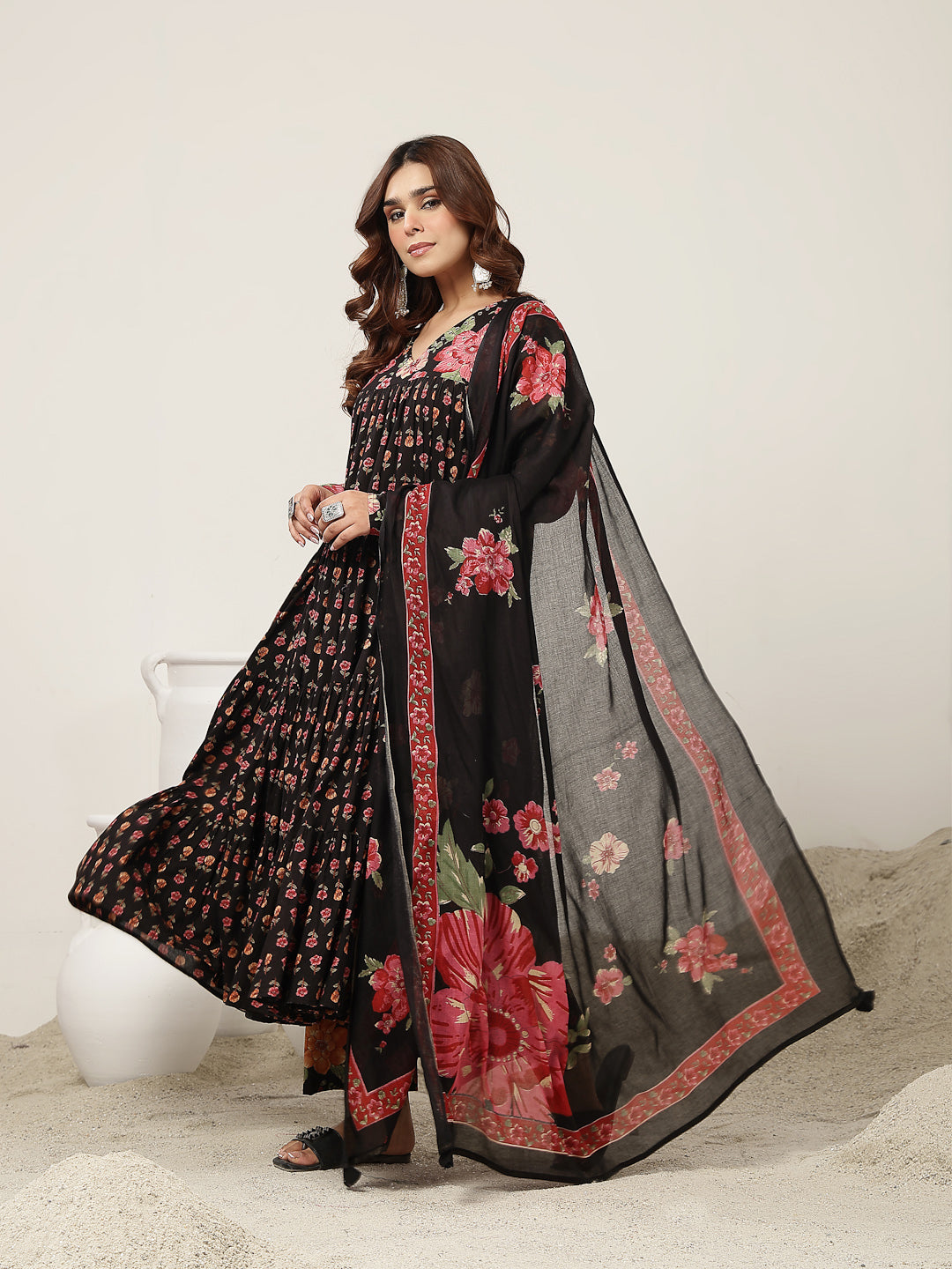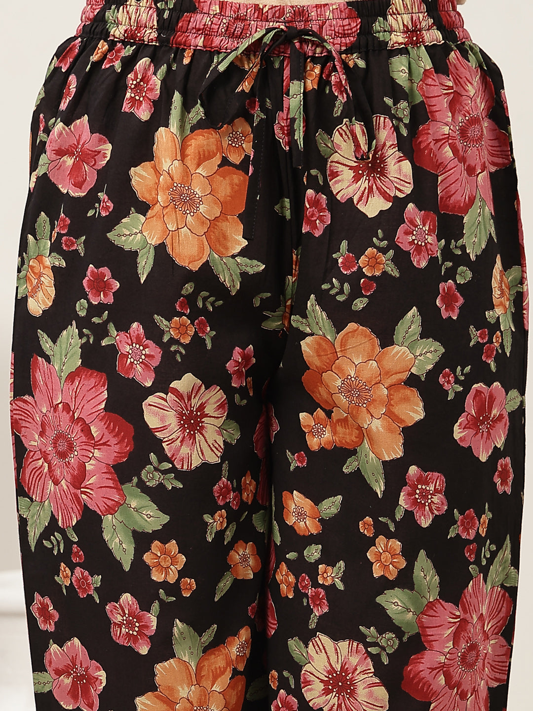 Gulmohar Jaipur Cotton Printed Kurta Suit Set in classic black. Crafted from breathable cotton fabric, this calf-length kurta features a graceful flared silhouette that offers both comfort and style. The V-neckline and full sleeves add a refined touch, while the beautiful printed design enhanced with subtle hand work lends timeless ethnic appeal. Paired with a matching palazzo in soft malmal fabric, this suit set is perfect for daily wear, festive gatherings, or casual occasions.