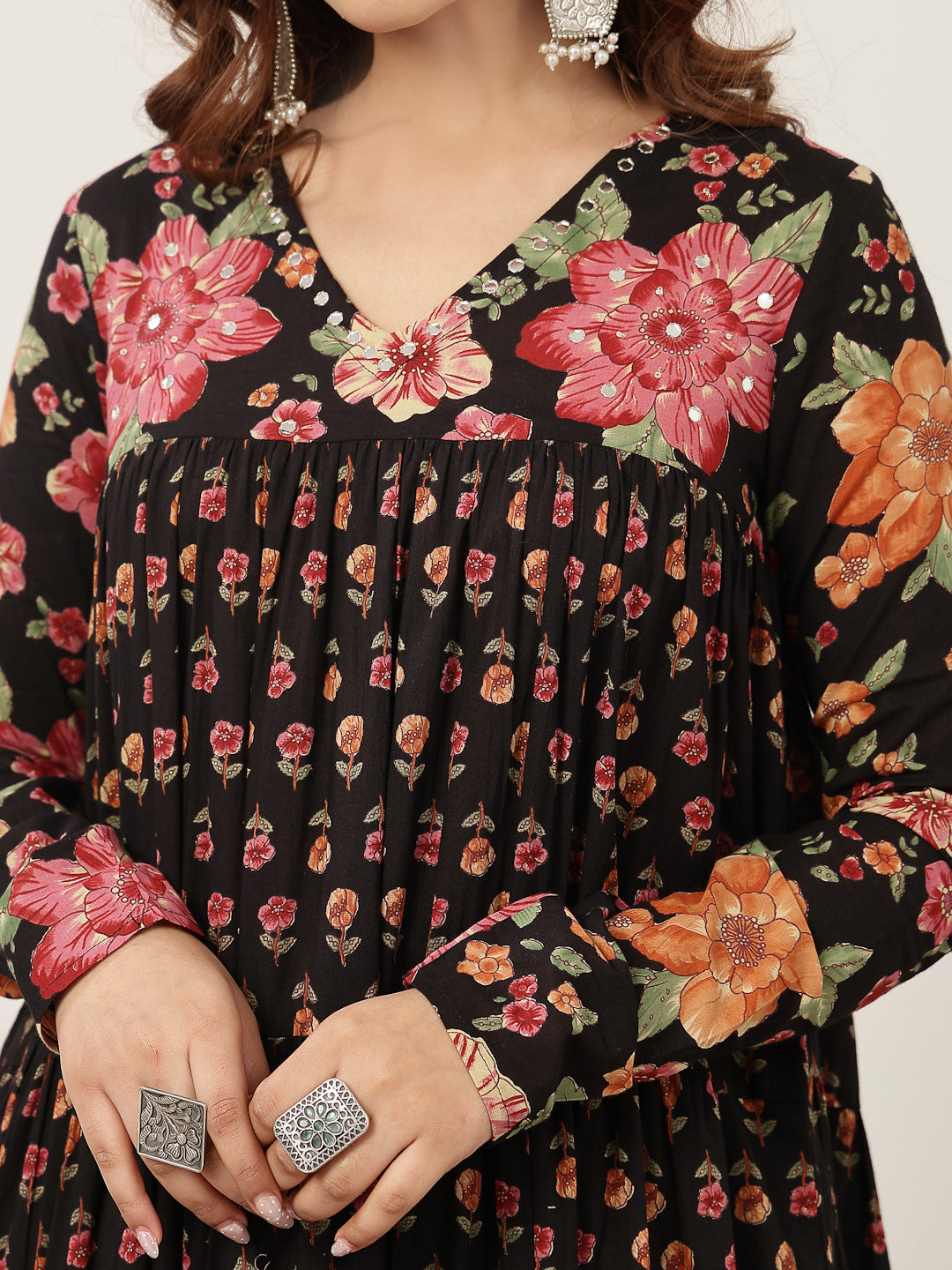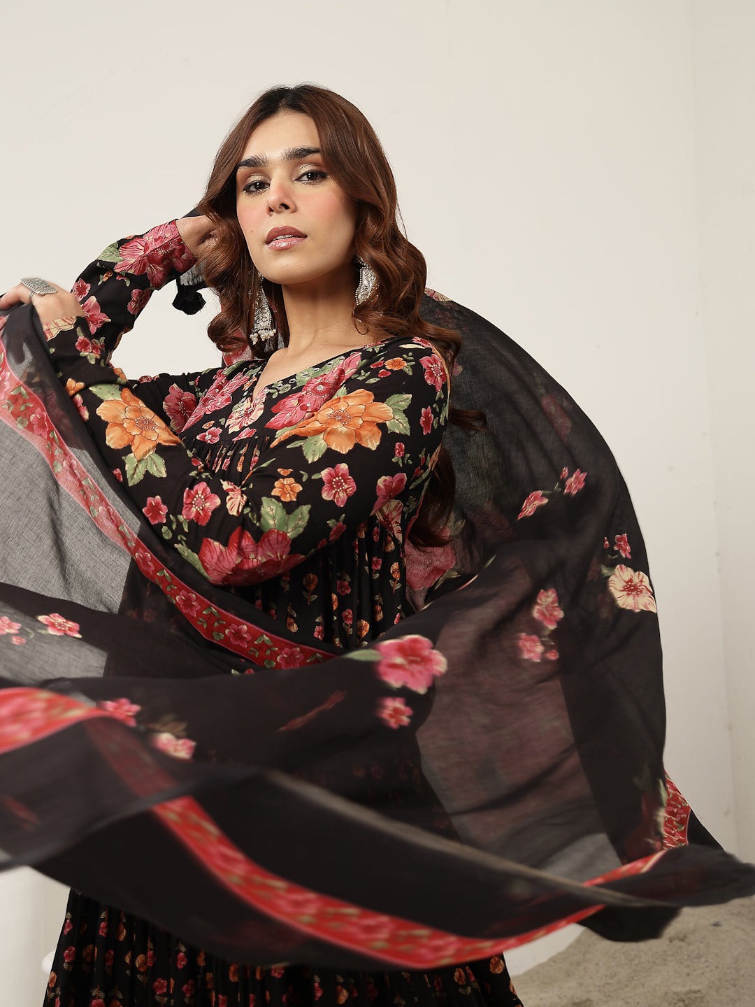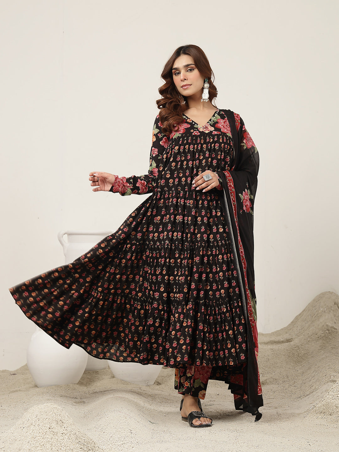 Gulmohar Jaipur Cotton Printed Kurta Suit Set in classic black. Crafted from breathable cotton fabric, this calf-length kurta features a graceful flared silhouette that offers both comfort and style. The V-neckline and full sleeves add a refined touch, while the beautiful printed design enhanced with subtle hand work lends timeless ethnic appeal. Paired with a matching palazzo in soft malmal fabric, this suit set is perfect for daily wear, festive gatherings, or casual occasions.