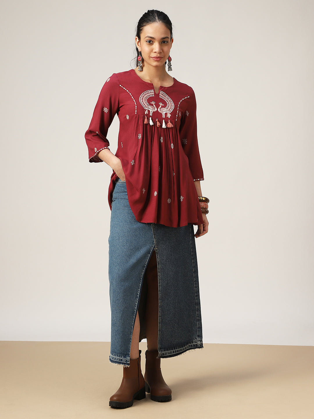 Gulmohar Jaipur Rayon Solid Flared Top in a rich maroon shade. Crafted from soft and flowy rayon fabric, this hip-length top ensures breathable comfort and a graceful drape. Designed with a classic round neckline and three-quarter sleeves, it features a flattering flared silhouette that enhances ease of movement. The solid base with subtle embroidered detailing makes it perfect for casual outings, workwear, or relaxed get-togethers.